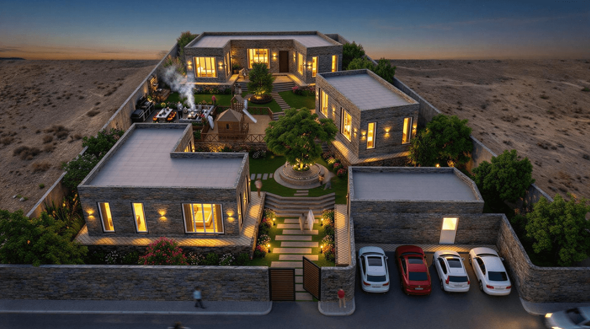 استراحة سياحية بتصميم معماري مستلهم من البيئة الجبلية والتراث المحلي، تتكون من ثلاثة أجنحة مستقلة تحيط بحديقة مركزية مشتركة. كل جناح يوفر خصوصية كاملة لأسرة أو مجموعة، مع مساحة مشتركة تعزز أجواء الألفة والتواصل.